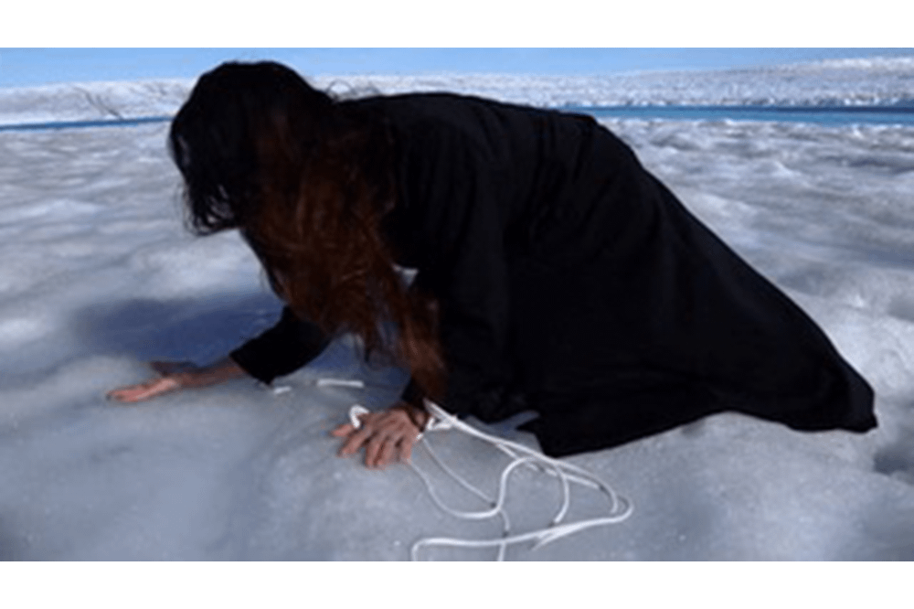 Arkhtico s Doloro s, 2019. Performance next to the Blue Lake at Sermeq Kujalleq Glacier, Ilulissat. Camera and edit: Tyler Levesque and Chelsea a. Reid